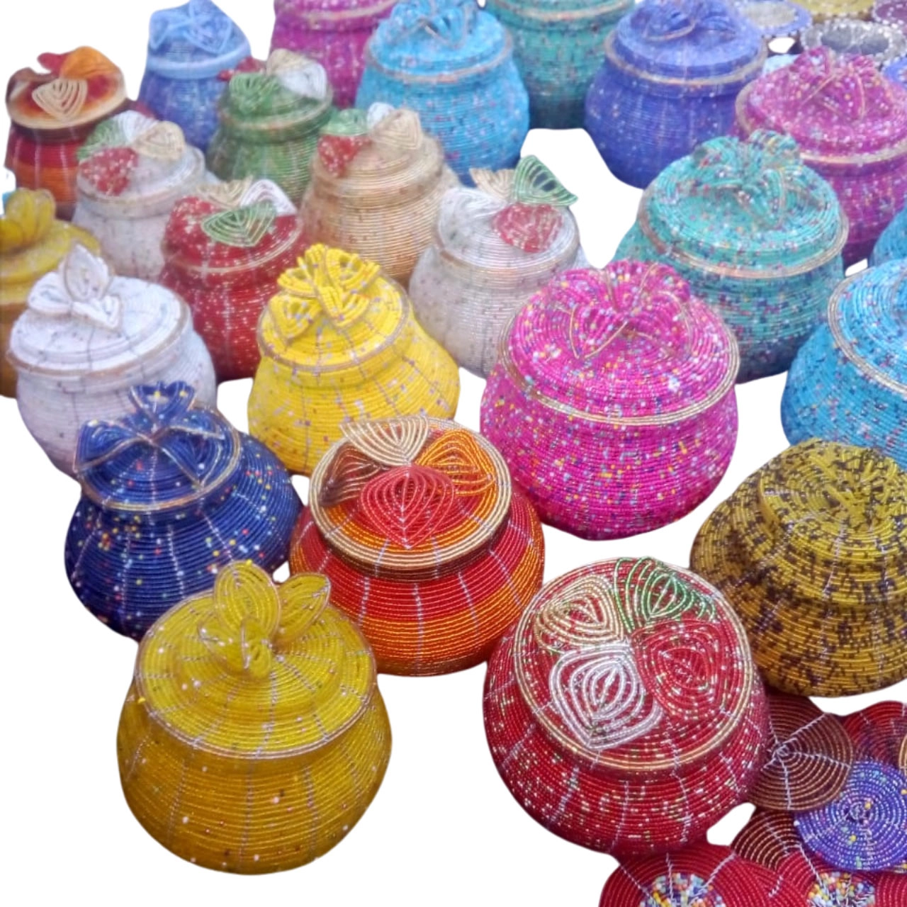 Jorova beaded pot basket with flowered lid